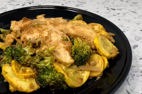 Spread out chicken and vegetables on a pan. Bake for 8 minutes, remove from oven, flip vegetables and chicken, and bake another 7-8 minutes. Wash the spatula after touching the raw chicken. Chicken should read an internal temperature of 165°F. Serve by itself, over rice, quinoa, or leafy greens.